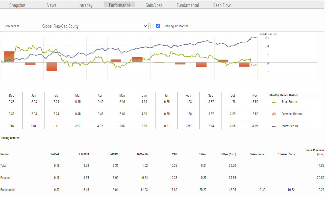 Next, we have the Performance screen which is where you can find your portfolio returns. More importantly, you can compare them to a benchmark during different time periods.