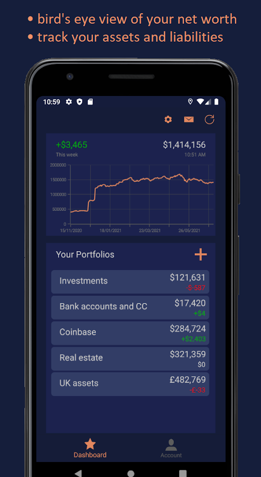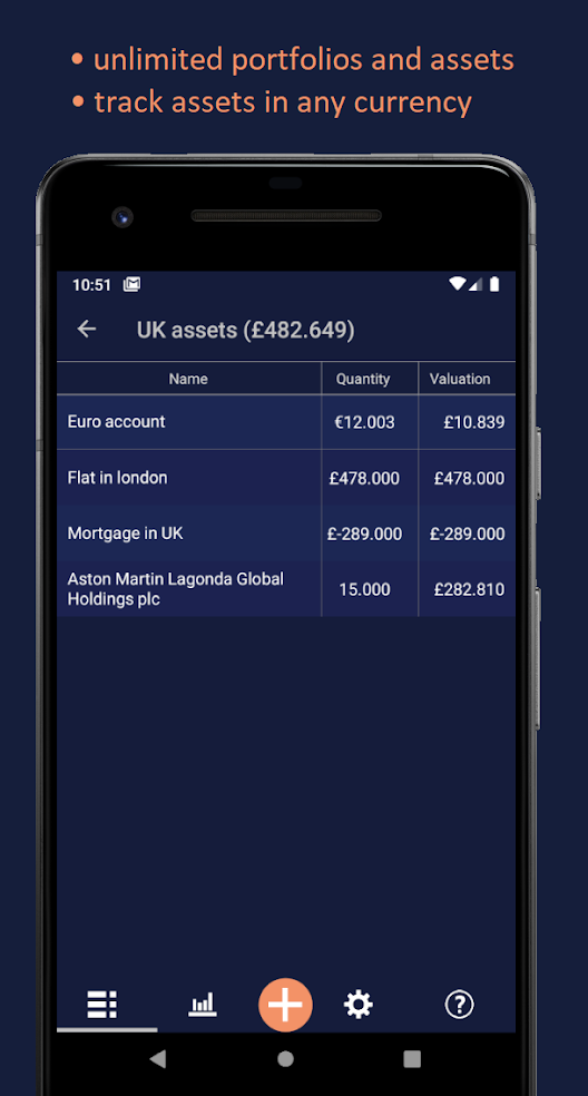- You add your assets like stocks, funds, crypto, home, cars, and even liabilities (like mortgage)