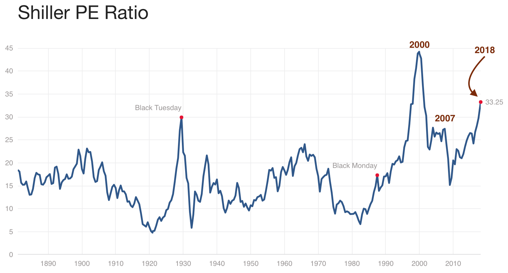 Let’s take the Shiller PE ratio, also known as the CAPE ratio (Cyclically adjusted price to earnings ratio). This popular metric measures the price of the overall US stock market compared to its average past 10-year real earnings per share.