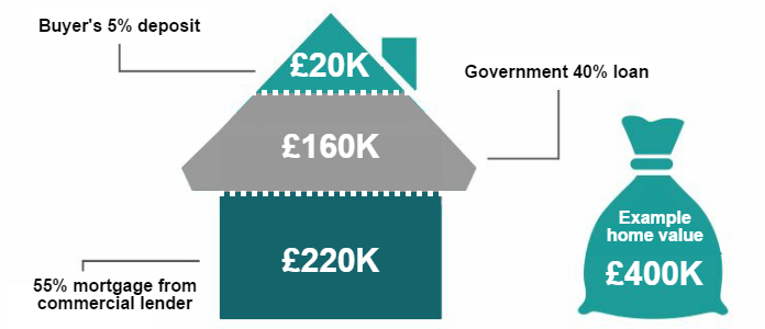 - Help-to-buy Equity Loan: The Government lends you 20% (or 40% in London) towards buying a new built home. You are not charged any loan fees for the first 5-years on this 20% loan. This makes buying much more affordable since you only need to deposit 5%. And because a picture is a thousand words: