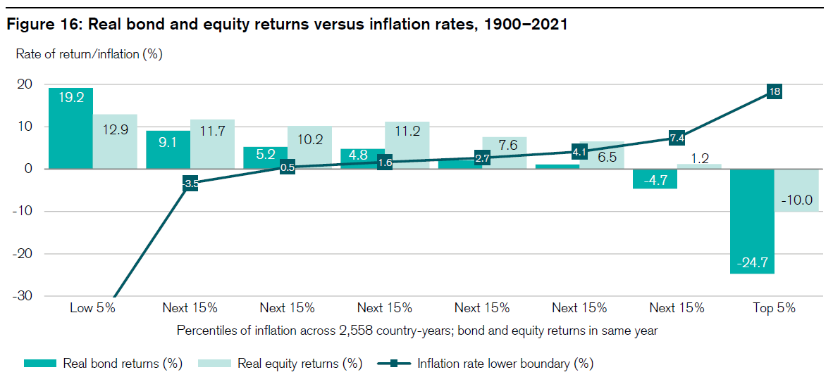 The last bucket is 18% inflation. We don’t live in an 18% inflation environment. But if we did, shares (-10%) would perform better than bonds (-24.7%). Worth noting that in an 18% inflation world, the -10% real return from shares is actually a positive 8% nominal return before inflation.