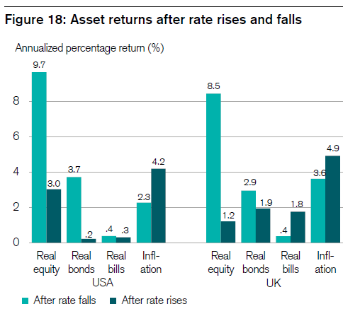 In periods of rising rates, equities returned just 3.0% after inflation, compared with 9.7% during rate falls.