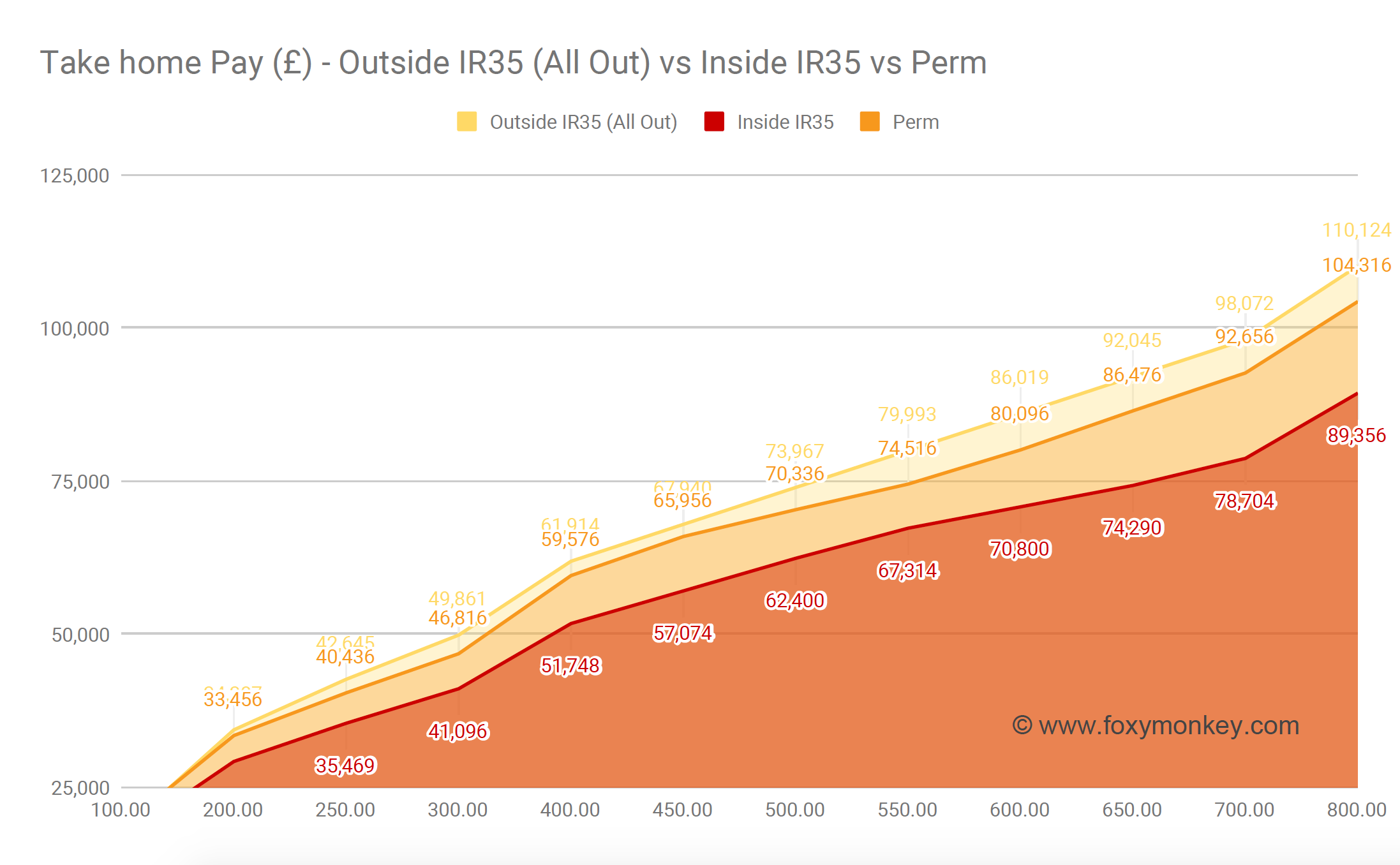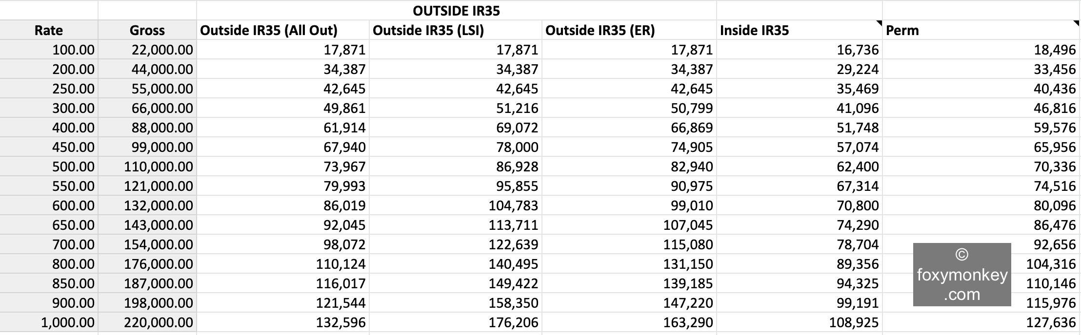 What if you switch to perm, instead? Let’s see how an Outside IR35 compares to the same gross income taken as a perm employee.