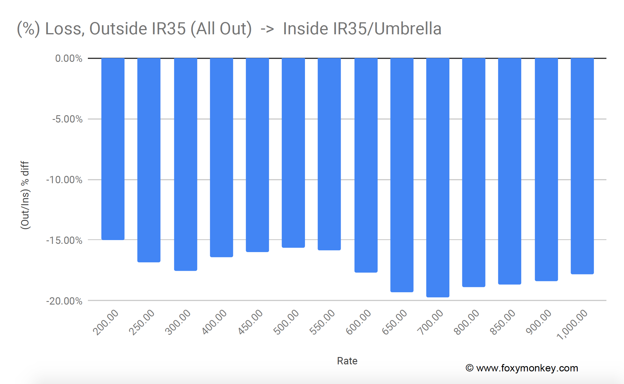 Punchline: For tax-inefficient contractors who take all money home, the difference between Outside IR35 -> Inside IR35 (or Umbrella) is between 15-20%.