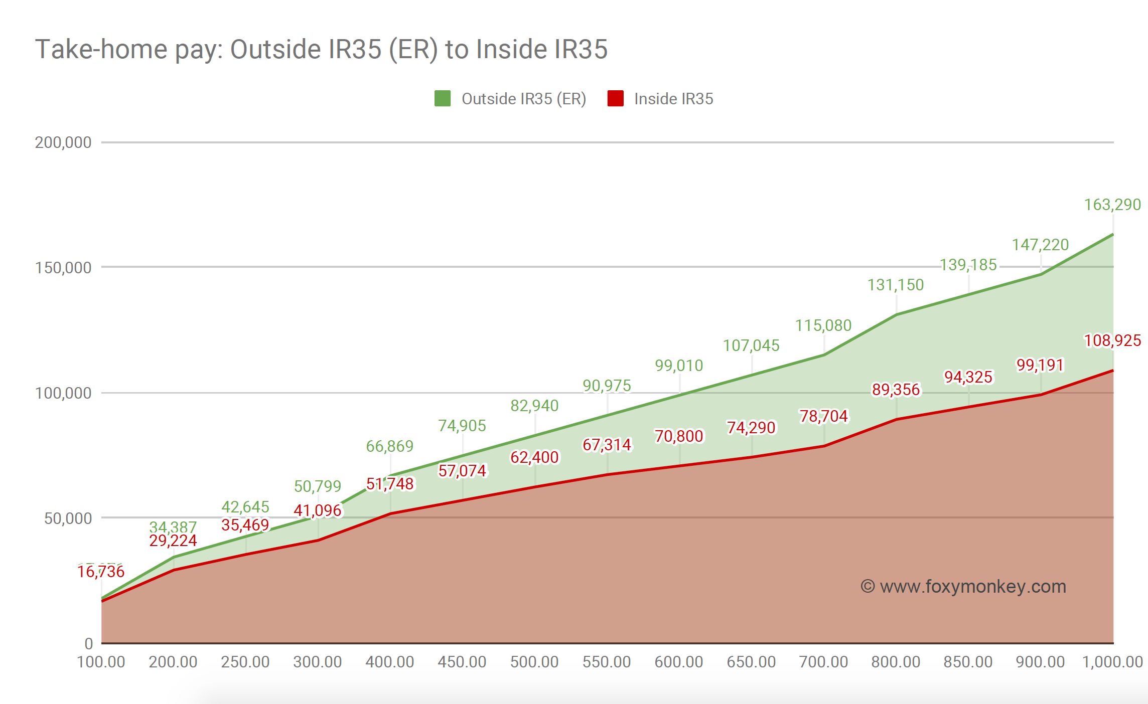 For starters, we assume that the Outside IR35 contractor takes all income home and leaves nothing in the company.