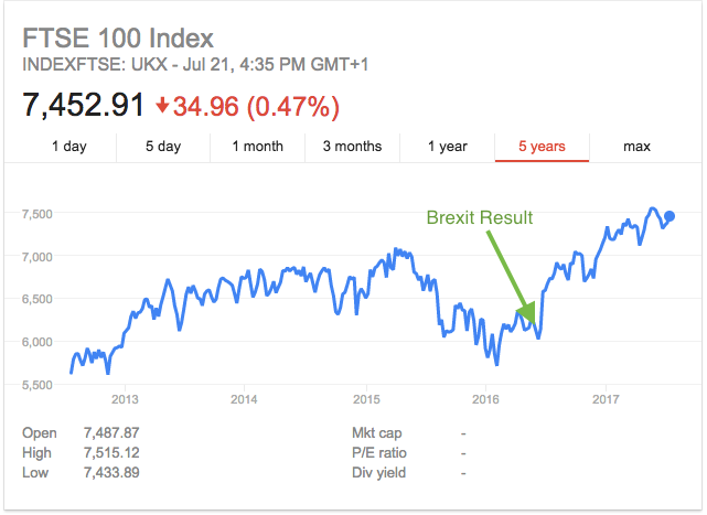 Brexit was just a tiny dot and a year later, the markets are up a hefty 21%. I guess we should wait a few years to realise the real long term impact of it. But, who knows, it may actually be a lot more positive given the British diplomatic skills.