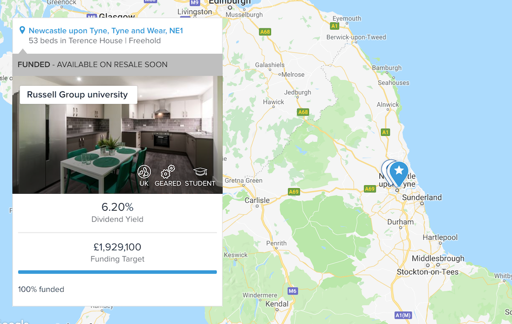 As you can see this is a student accommodation of 56 units and seeks £1,929,100 in funding (51% LTV). So people can allocate money towards this deal. Once the fund target is met the property is bought.